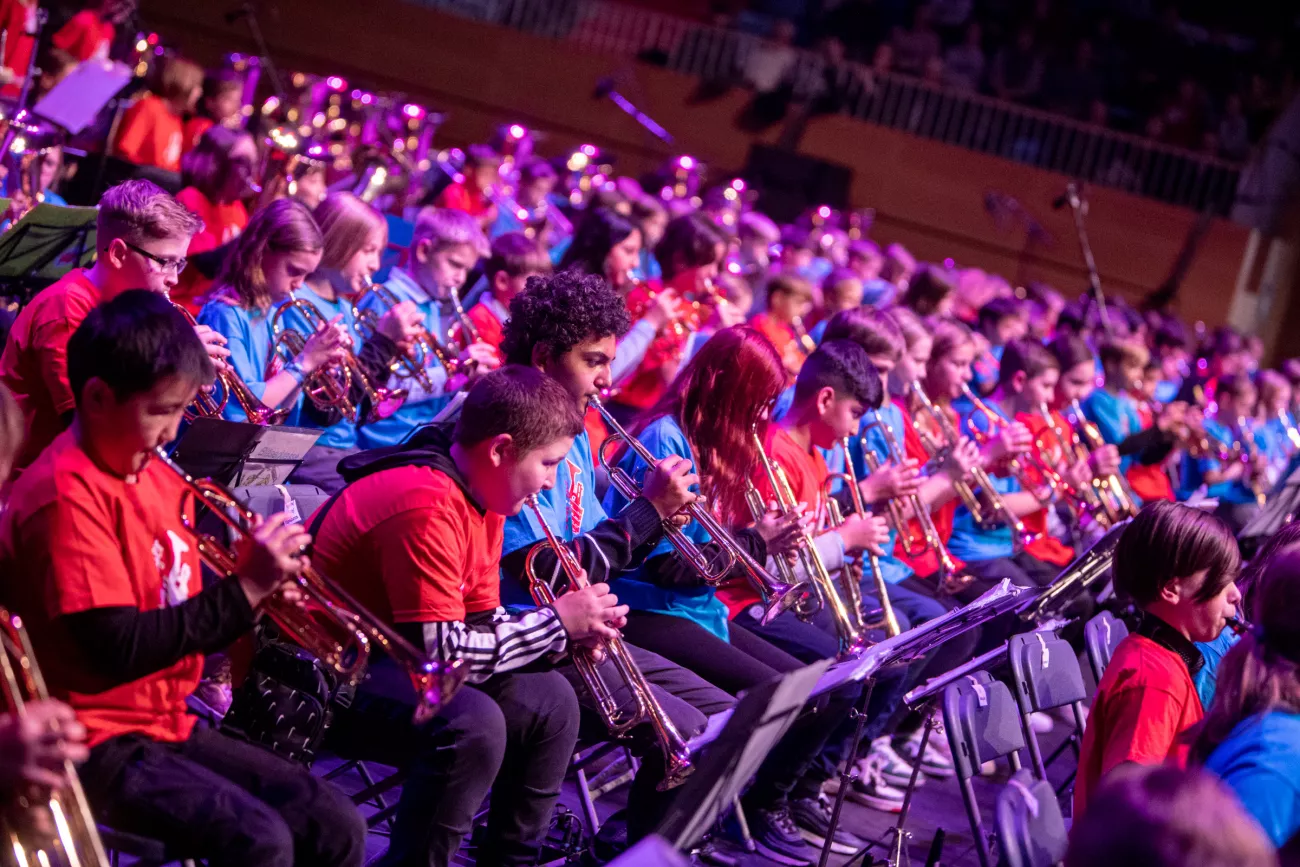 Erstmalig fand das große Bläserklassentreffen in diesem Jahr gleich in doppelter Ausführung statt: 2 beeindruckende Konzerte spielten die insgesamt 570 musizierenden Kinder vor über 2.000 Gästen.